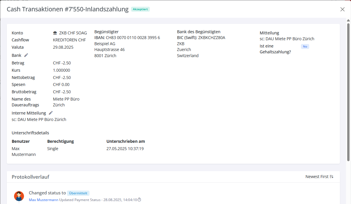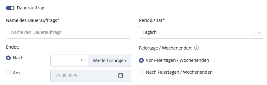 Einzelzahlungen können auf Wunsch als Daueraufträge eingerichtet werden, um regelmässige Zahlungen automatisch zu verarbeiten. Dies spart Zeit und reduziert den manuellen Aufwand erheblich.