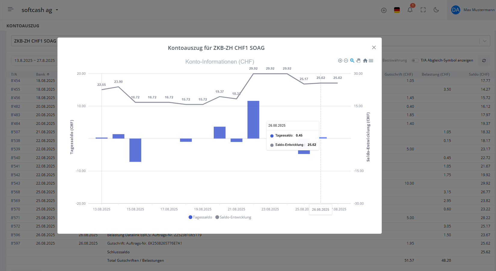 Basierend auf den camt.053-Dateien können Sie tagesaktuelle Kontoauszüge mit abgeschlossenen Transaktionen einsehen. Diese Informationen bieten Ihnen detaillierte Einblicke in die täglichen Kontobewegungen und helfen Ihnen, den Status Ihrer Finanzflüsse für jede Bankverbindung zu verfolgen.