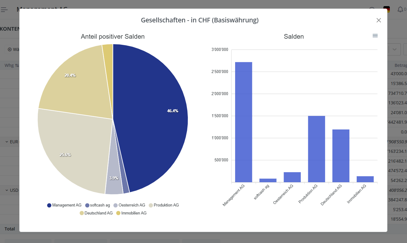 - Flexible Gruppierungen: Nutzen Sie die Möglichkeit, Ihre Konten nach beliebigen Kriterien zu gruppieren, um individuelle Analysen durchzuführen. Sie können z.B. eine Gruppierung nach Gesellschaft und Währung erstellen oder nach Konto-Art und Bank.